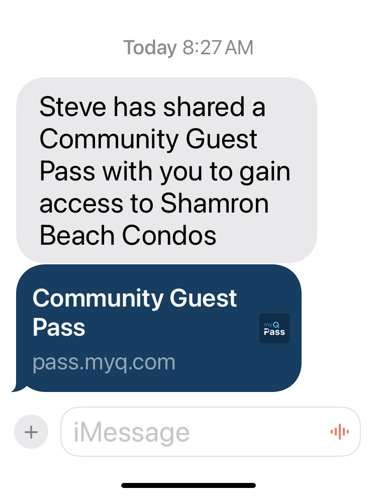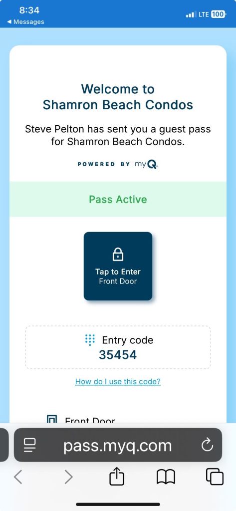 Click on the Community Guest Pass from the text message sent to you and Tap the Blue button to Enter the Front Door.