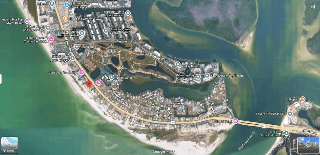 Address: 7650 Estero Blvd Fort Myers Beach FL (see red pin on map below)