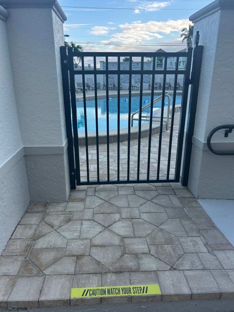 There are no bathrooms in the Party Porch, but the pool bathrooms and the bathrooms in our unit 705 will be available. The pool bathrooms are across from the lobby door. Pull up on the handle at the top of the gate and then pull the gate towards you to enter the pool area.