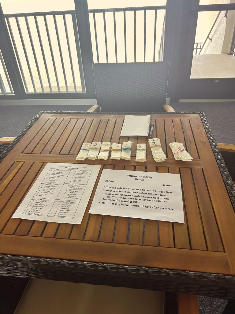 Shamron Beach has a slightly different version of the horse race. Each of you will be given a sheet with the names of each of the 8 horses in each of the 6 races. Steve will be the bookie, taking money before the race and paying out the winners.