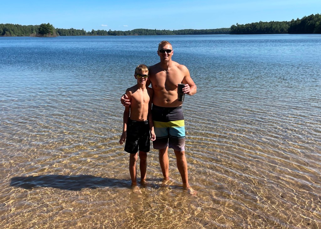 We quickly loaded the canoe and headed back to camp. As I backed the truck into our site, I noticed that it was only 4:00 and asked Will if he wanted to go swimming to cool off. Both Scott and Will quickly supported this idea and we drove to the beautiful Clark Lake beach and picnic area. Crystal clear shallow water and clean sand made the perfect place to cool off after a long day paddling and portaging. We met several nice people and a couple of good dogs, everyone was enjoying the gorgeous day!