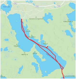 Packed the truck and drove 137 miles to the Sylvania Wilderness with a stop for breakfast in Minocqua. Followed Apple maps through a series of twists and turns around Bolder Junction WI, before crossing into the Upper Peninsula of Michigan and found our way to the park ranger station, closed due to COVID. We arrived at our campsite before 11:00 and quickly setup camp.