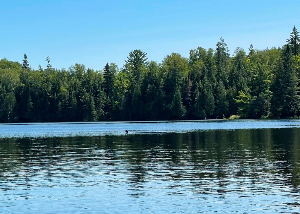 Kerr Lake is small lake, surrounded by high hills and tall trees that protected the lake from the wind. The crystal clear water was smooth as glass! We watch more Loons before chasing up a small flock of ducks as we reached the landing. Scott handled the long (97 rod) portage to West Bear Lake with relative ease. I could not keep up with him through the very well maintained portage trail.
