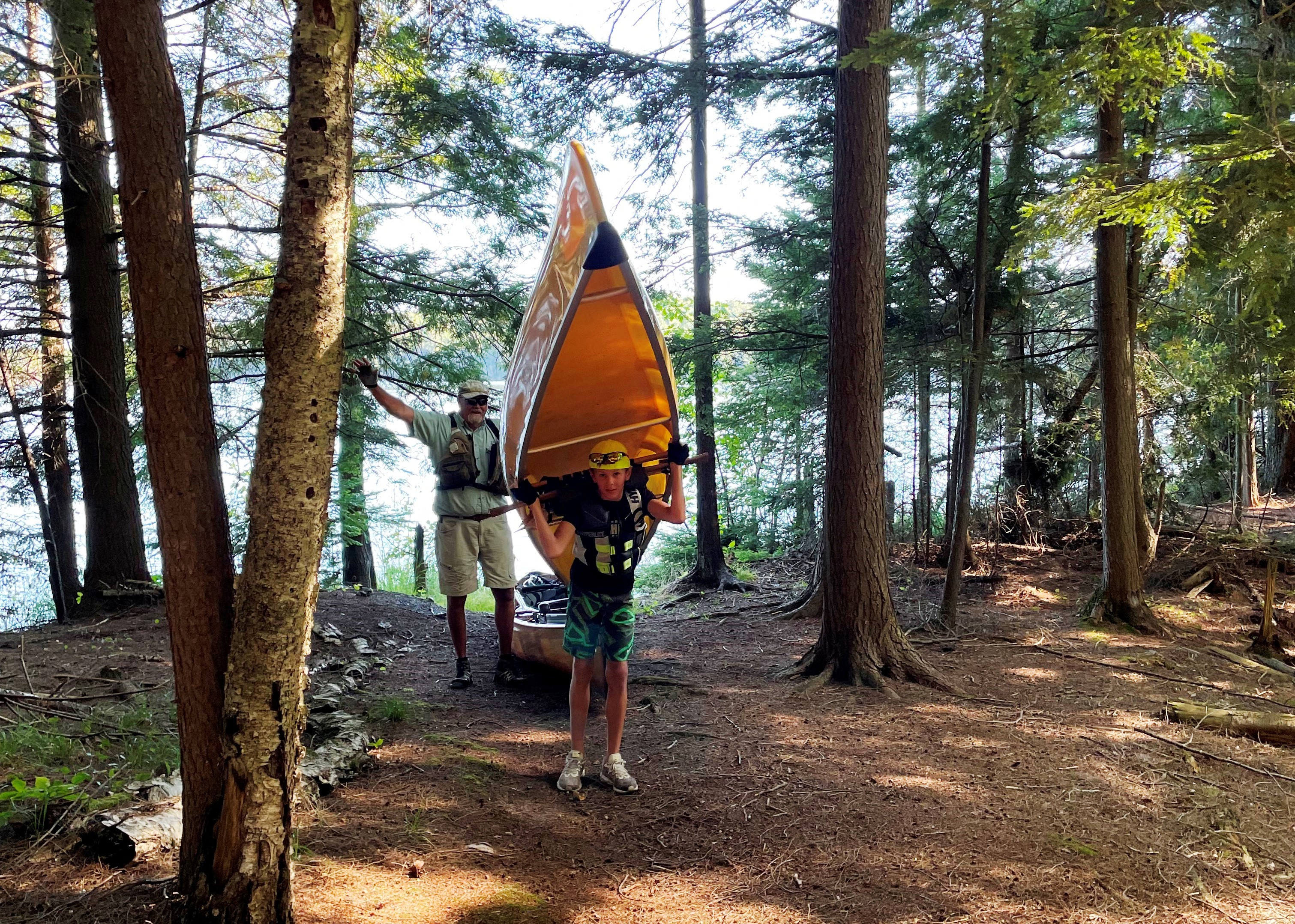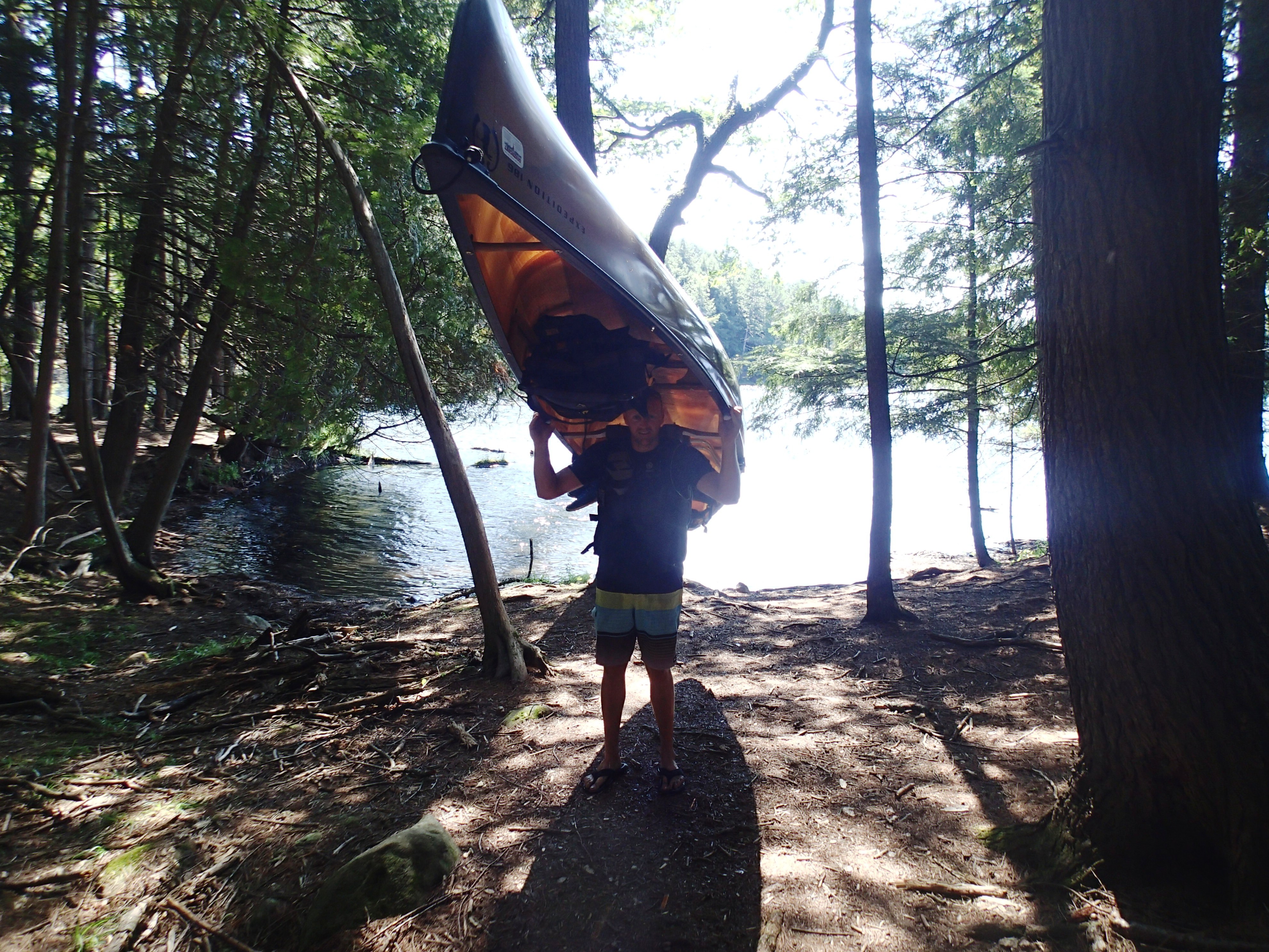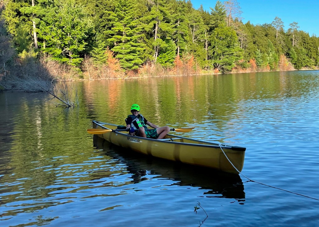 We retraced our route back towards the truck. When we reached the small, protected Florence Lake, Will asked to take out the solo canoe and he did great – paddling across the lake to the next portage. Will tried to portage the canoe, but did not go very far. Still pretty impressive for a 10 year old!