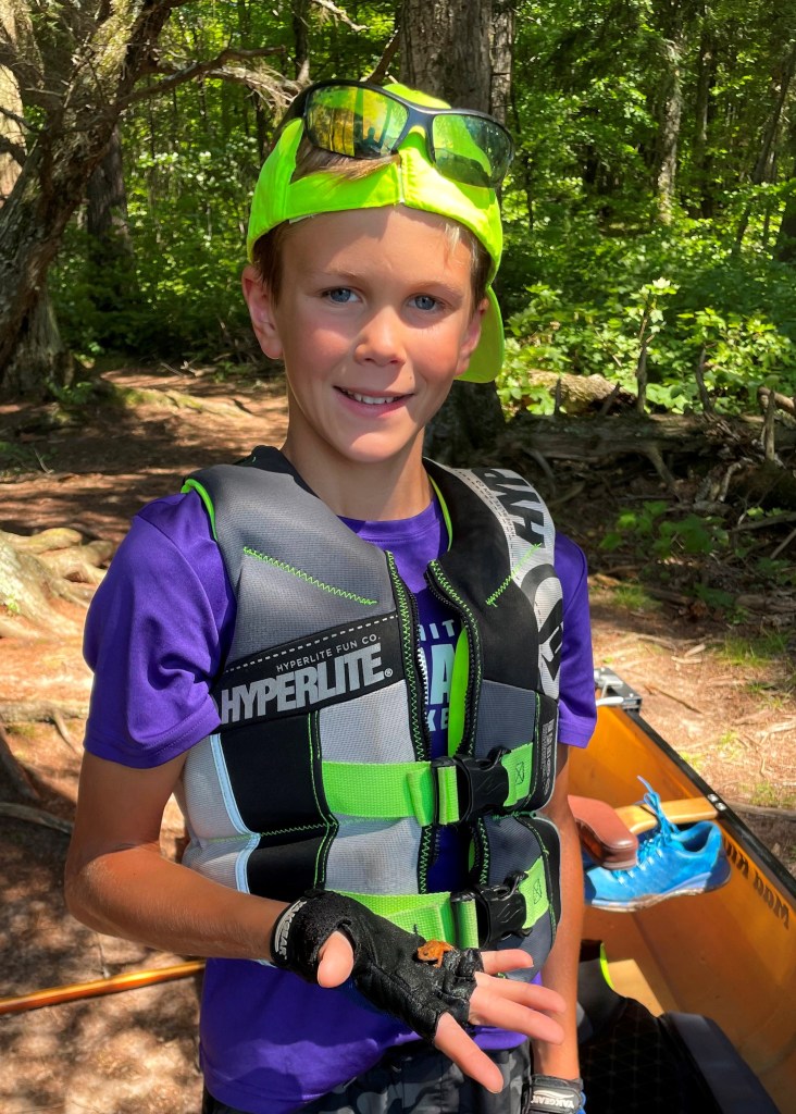 We paddled across West Bear and found the portage hidden behind a small island. We made the 40 rod portage from West Bear to East Bear Lakes. Will ran ahead and found several small frogs.