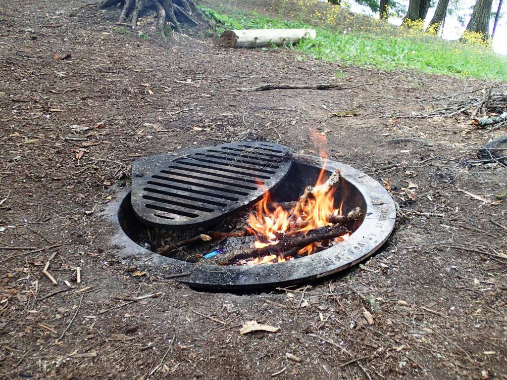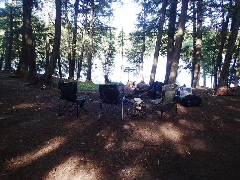A hoot owl woke me up overnight and I got up early to start packing up my gear. It was noticeably cooler with a strong breeze – good drying weather after the rain overnight. Sun breaking through the clouds shimmered across the lake. Started coffee and continued to read Covered Waters before Kara joined me and started a fire. Grace slept in. Breakfast of egg muffins with Canadian bacon.