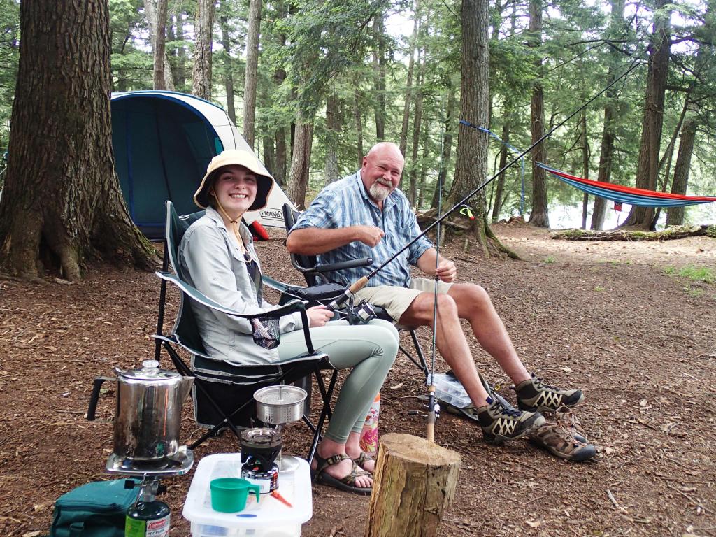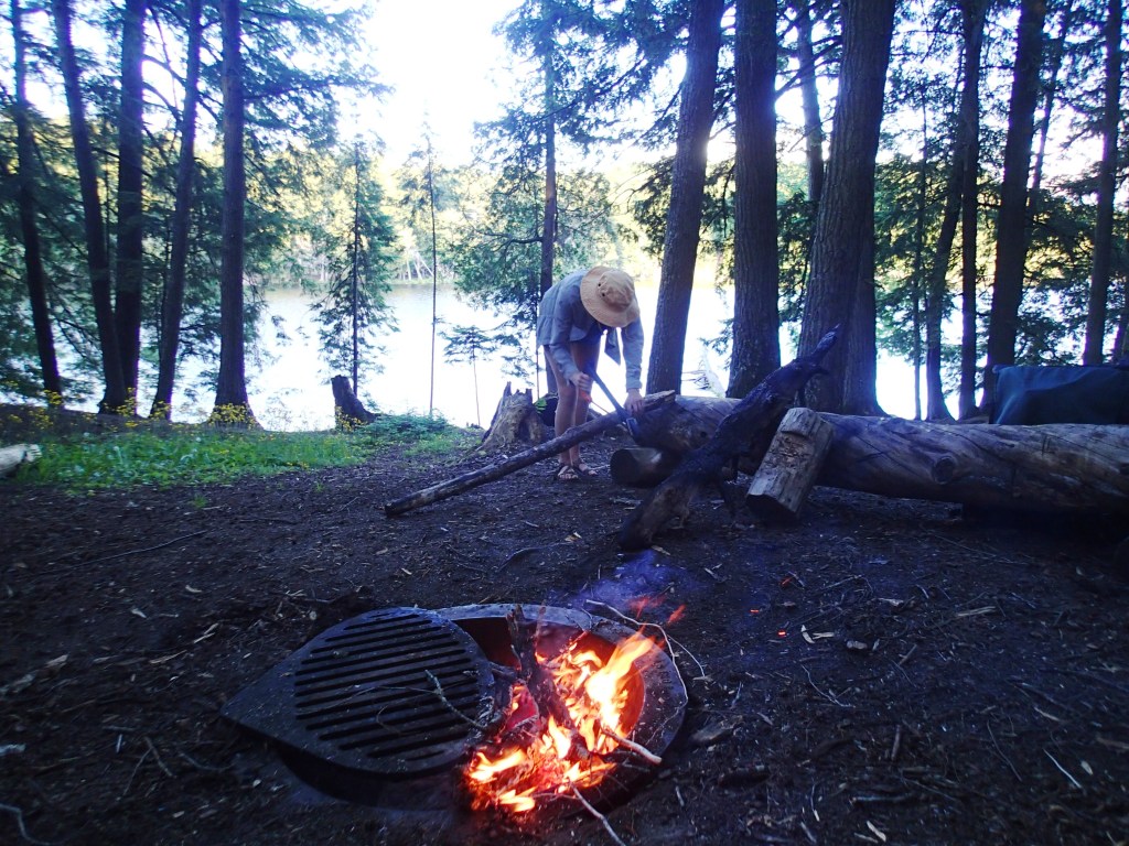 Sunrise came early, just 13 days from summer solstice. Woke to the sounds of loons calling and birds signing. Very still, the bugs were thick until Kara built a fire. Enjoyed a pot of coffee while Grace slept. Enjoyed a hardy breakfast of biscuits and gravy.