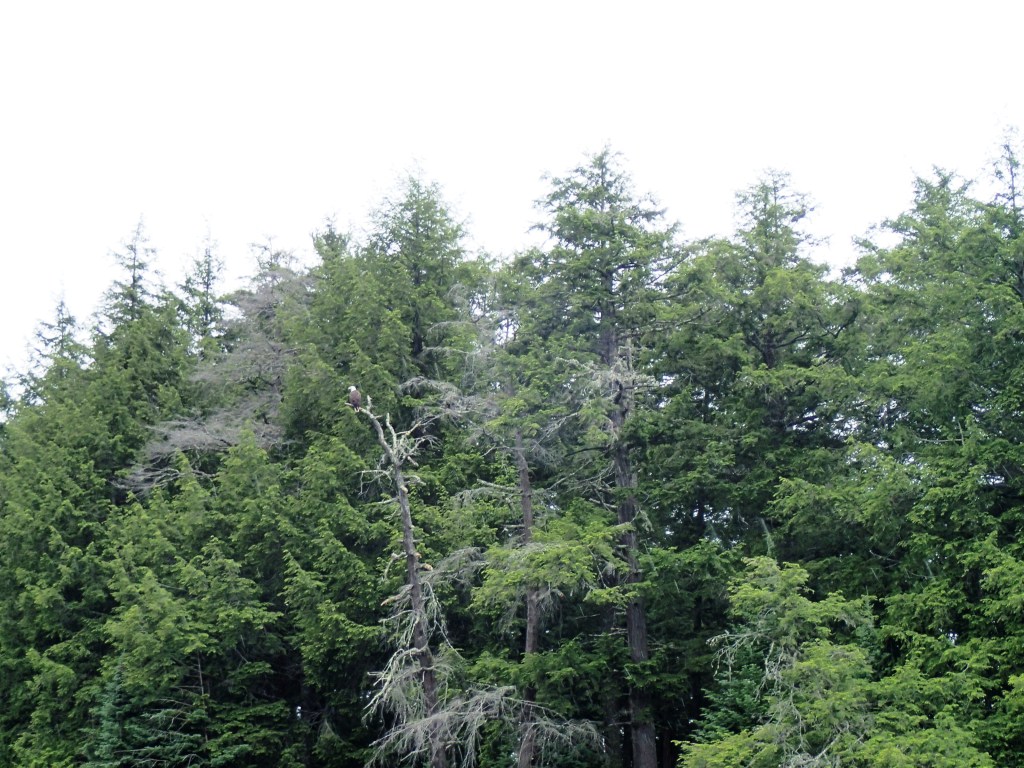 I helped launch Grace and Kara away from the landing, but the strong wind pushed them into the downed trees in the water. They were stuck, so I paddled over, stepped out of the solo canoe into waist deep water so Grace could get in. Next, I put Kara in the front of the tandem canoe while I took the rear. Grace was able to paddle the solo canoe back to the landing, but struggled with the strong wind. We tied the solo canoe to the back of the tandem and towed Grace into the teeth of the wind across Mountain Lake as a light rain began to fall. After the short portage, we were back on Crooked Lake and heading for our camp. We had a Bald Eagle pose for us on a dead tree branch.