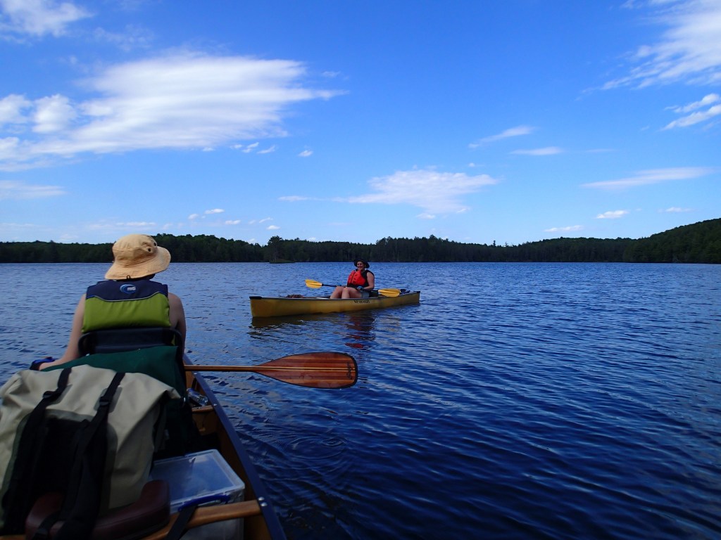 Grace slept while we drove to Eagle River WI for lunch and then crossed the border into the Upper Peninsula of Michigan – aka the UP. We turned left/west on US 2 in Watersmeet, MI and arrived in the Sylvania Wilderness Area. It was a beautiful day with blue skies and light wind when we unloaded the truck into the canoes and we were off!