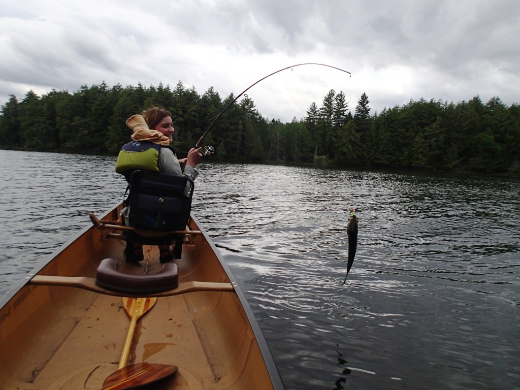 We were tired from a tough paddle, but Grace wanted to go fishing, so I setup a couple portable rods and we went out to fish our little bay in front of our camp.
