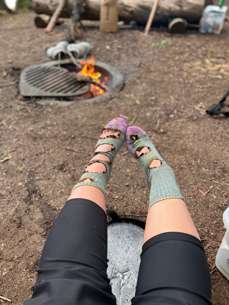 Kara had mixed results when trying to dry her socks over the fire.