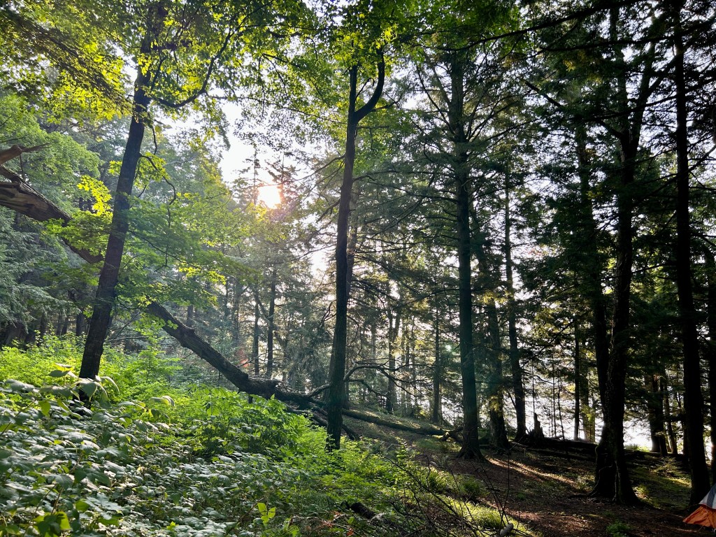 I slept poorly with my tent on a slope. With the forecast calling for hot weather, we were not prepared for a cold night in the 40’s. Brianna and I got up early and had a nice chat as the sun came up through the trees.