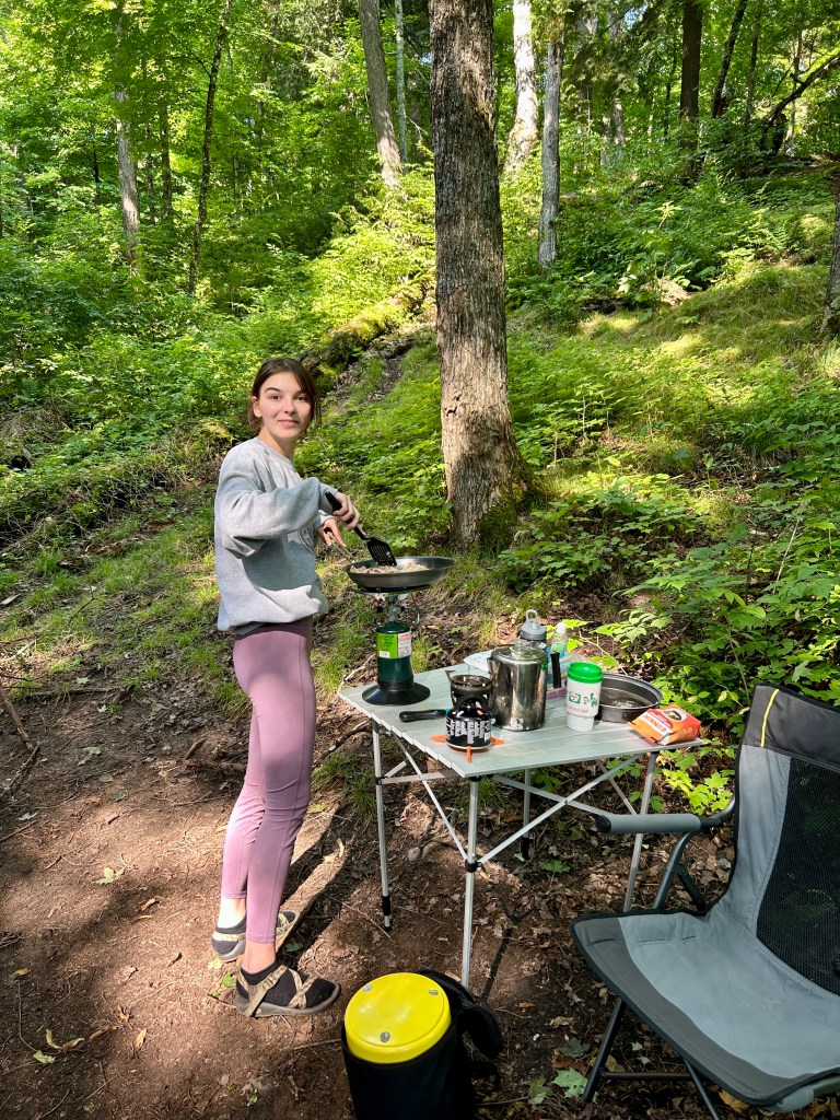 The wind died down and it became rather humid and sticky. I made Mac ‘n Cheese for dinner and the girls enjoyed dark chocolate cheesecake. The girls made a nice campfire. The bugs chased us into the tents early.